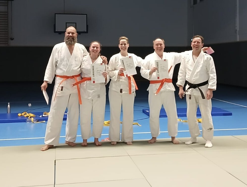 Zum Jahresende erreichten bei einer weiteren Gürtelprüfung vier Ju-Jutsukas den 4.Kyu (Orangegurt). Herzlichen Glückwunsch an Uta, Johanna, Dirk und Lars für diese tolle Leistung.